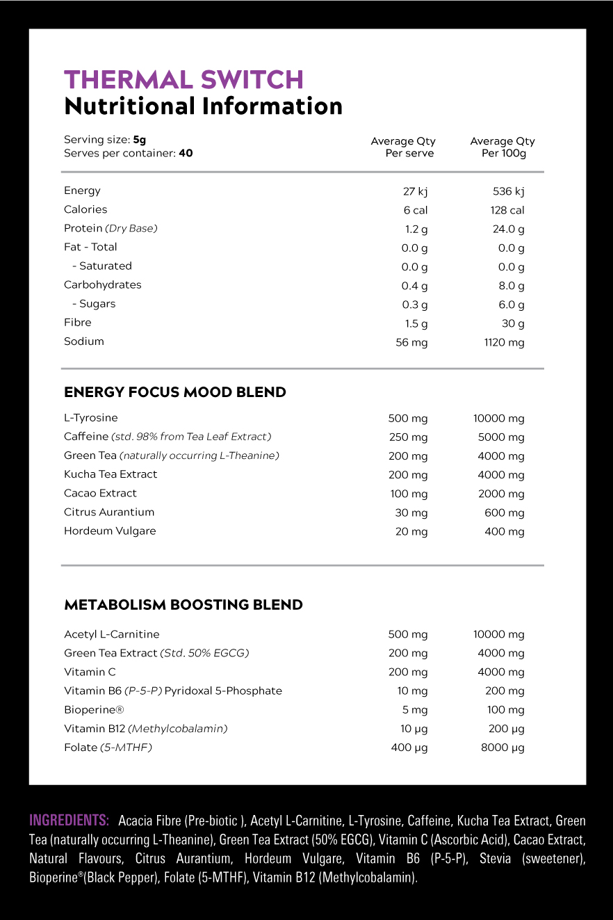THERMAL SWITCH™ features a fully loaded formula Acetyl L-Carnitine, naturally occurring Caffeine and Epigallocatechin Gallate (EGCG) from Green Tea. We've also added L-Tyrosine and Kucha tea to take things up a level.